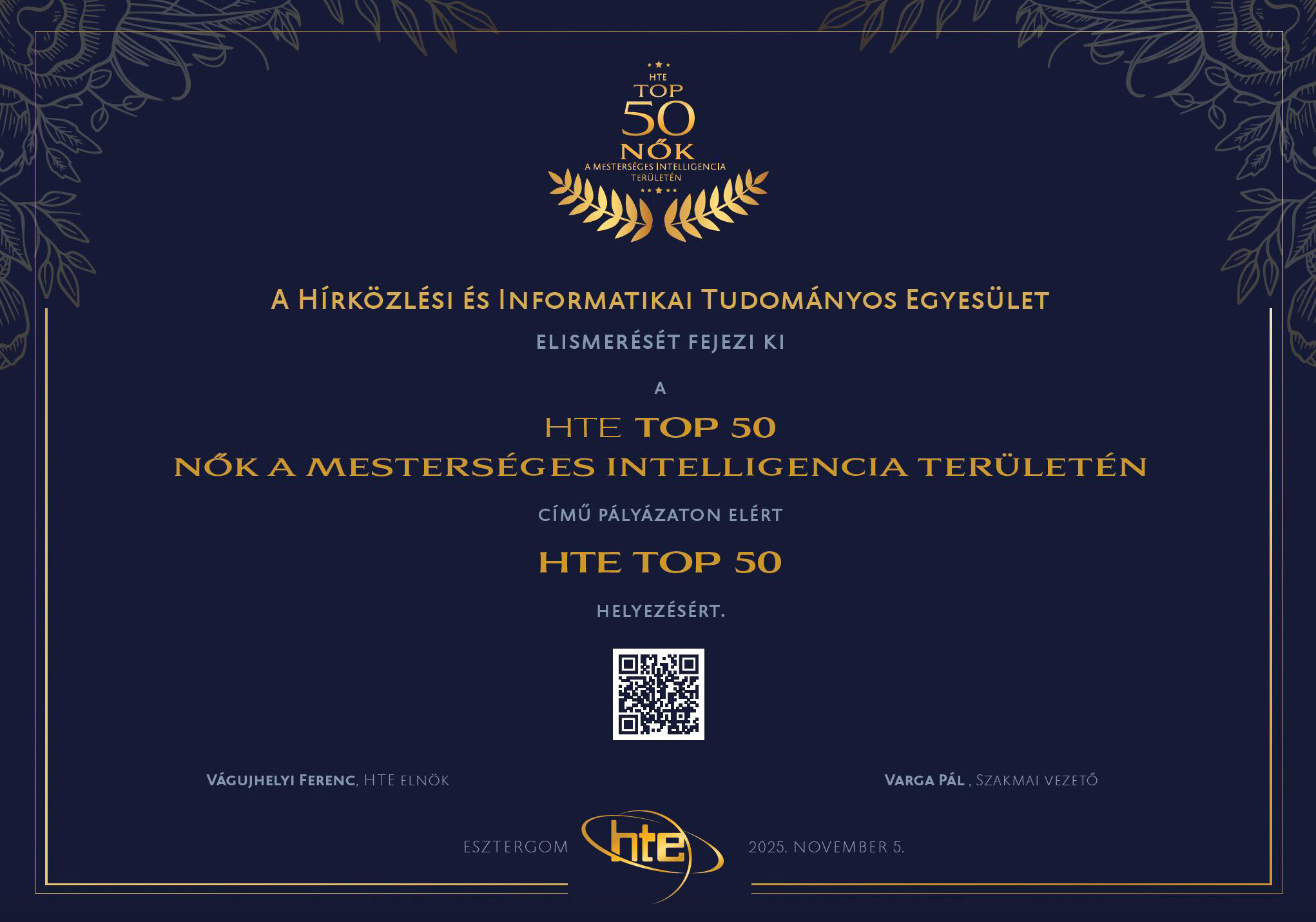 Honored to be named among the Top 50 Women in AI in Hungary by the Hírközlési és Informatikai Tudományos Egyesület (HTE) celebrating women who are shaping teaching and research with AI in diverse contexts.